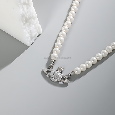 Collar de plata 925 Retro, colgante de Saturno con diamantes completos, cadena de perlas, colgante de constelación, joyería celestial para mujer